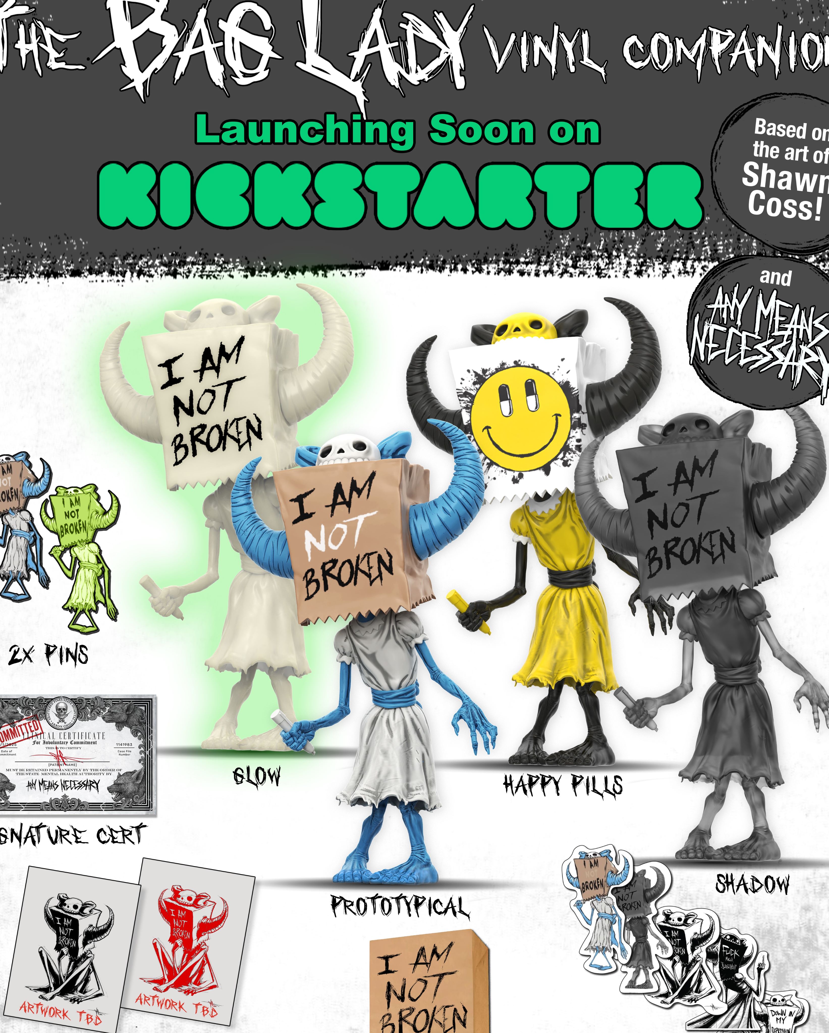 The campaign will debut with the Vinyl Companion Bag Lady figure — a striking translation of Coss’s signature imagery into a collectible medium. Four distinct variants will be available at launch, each with exclusive details designed to appeal to longtime fans and new collectors alike.