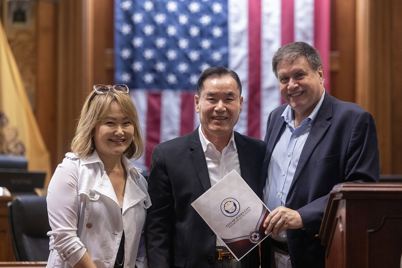 Assemblywoman Ellen Park (D-37) opened with remarks on the importance of heritage in public life and praised Jersey City’s commitment to diversity. Performances of the U.S. and Korean national anthems by Luca Kang (11) and Shinhee “Eva” Yoon (15) of the New Jersey Children’s Choir brought the chamber to a standing ovation.